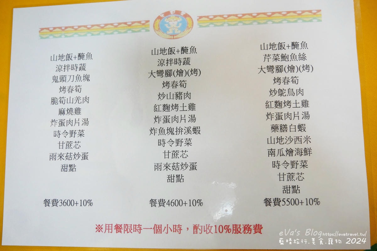 過年期間,米巴奈山地美食坊僅提供合菜套餐,適合多人聚餐,共有三種價位:$3,600、$4,600 和 $5,500,需另加 10% 服務費,用餐時間限制為 1 小時