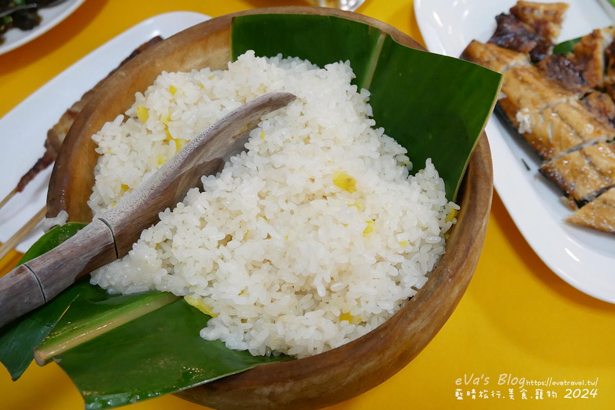 由於我們家人數較少,事先電話訂位時詢問店家,店家也允許從合菜中挑選幾道料理單點,這次我們選了:山地飯+醃魚、雨來菇炒蛋、烤春筍、紅麴烤土雞及炸蛋肉片湯,每道都充分展現原住民風味與當地新鮮食材特色