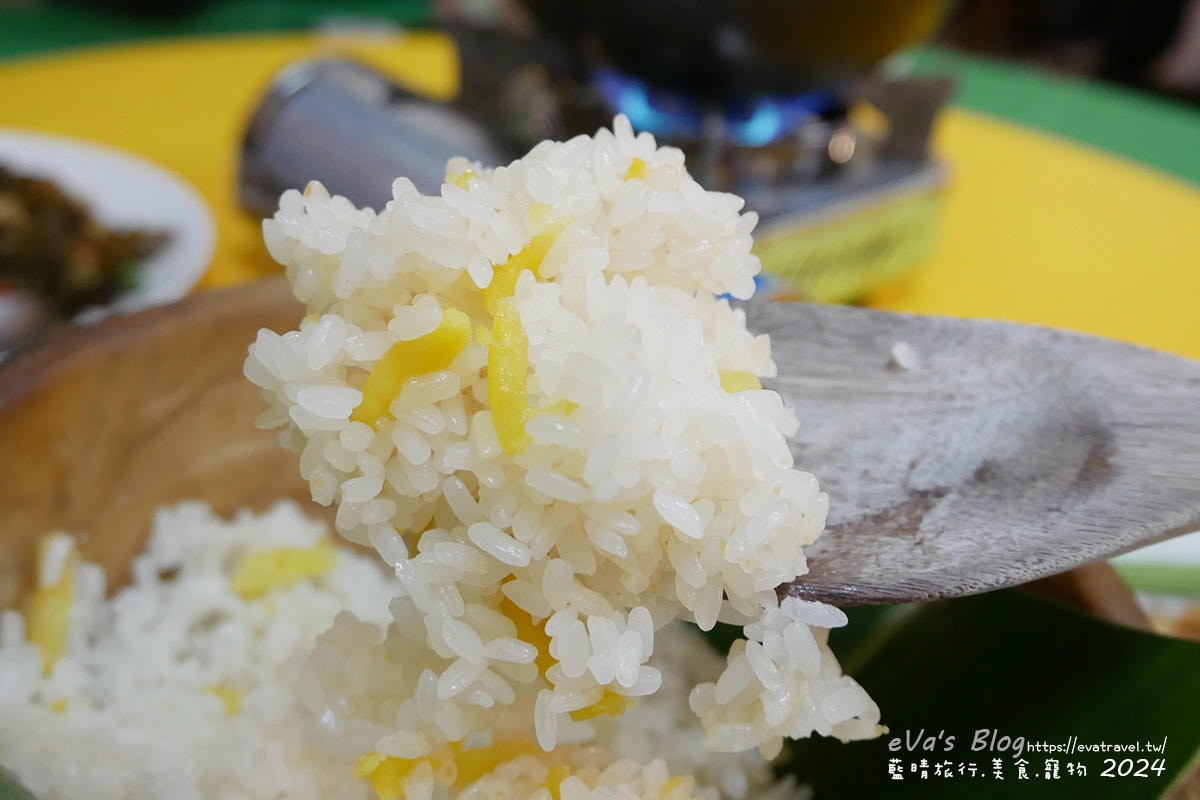 米巴奈山地美食坊的 山地飯 以糯米混合白米,再加入地瓜絲,米飯香 Q 有嚼勁,口感略帶麻糬感,但不黏膩,非常好入口,搭配 醃魚 一起享用,鹹香滋味恰到好處,醃魚選用鯖魚,處理方式類似一夜干,先烤再煎,香氣濃郁,這道 山地飯+醃魚 不僅好吃,也非常下飯,是必點的原住民風味料理之一