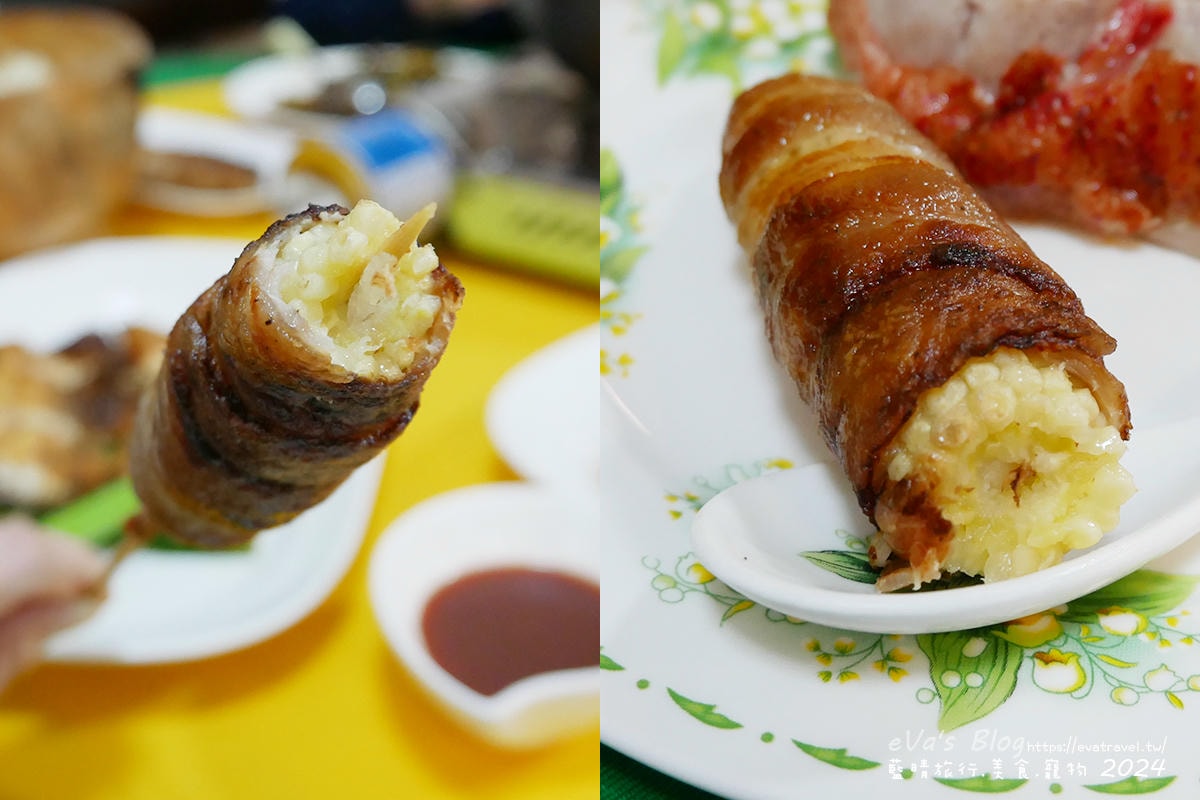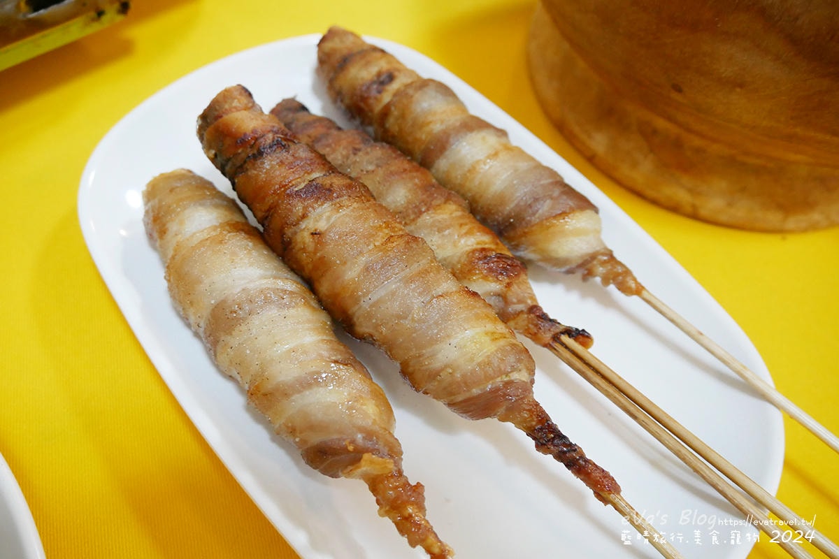 這道 烤春筍 是米巴奈山地美食坊的招牌特色料理,也曾申請過專利!鮮嫩的玉米筍外包裹著香噴噴的五花肉,五花肉口感鹹香微脆,玉米筍則保留自然的鮮甜滋味,這道創意原住民料理吃起來口感豐富又特別,非常推薦搭配山地飯一起享用