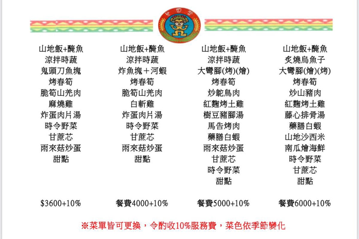 合菜套餐則分為 $3,600、$4,000、$5,000 及 $6,000 元,均需另加 10% 服務費,菜色會依季節調整,適合多人聚餐享用原住民特色料理